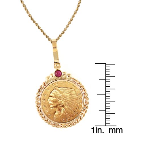 Deals $2.50 Indian Head Gold Piece Quarter Eagle Coin in 14k Gold Twisted Rope Bezel w/Ruby (24" - 14k Gold Rope Chain)